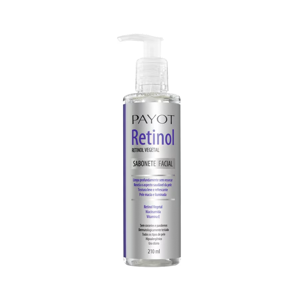 O Sabonete Facial Retinol Payot limpa profundamente sem ressecar a pele. Sua fórmula revitalizante minimiza a oleosidade. Mantém a pele macia e iluminada ao longo do dia. A combinação de RETINOL VEGETAL, NIACINAMIDA E VITAMINA E ajuda a hidratar, proteger e promover a aparência de uma pele renovada. Possui uma textura leve e espuma cremosa. Produto livre de parabenos e corantes. Utilizamos um ativo de origem vegetal (Phyto-Retinol), que não possui os efeitos adversos do retinol tradicional.